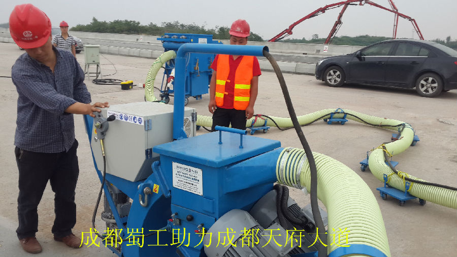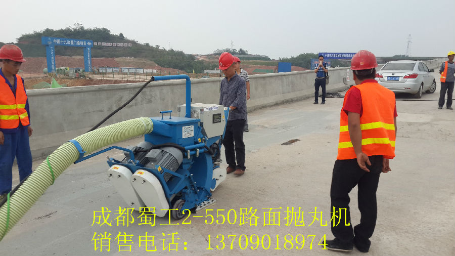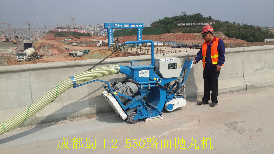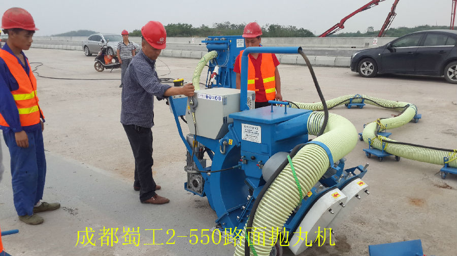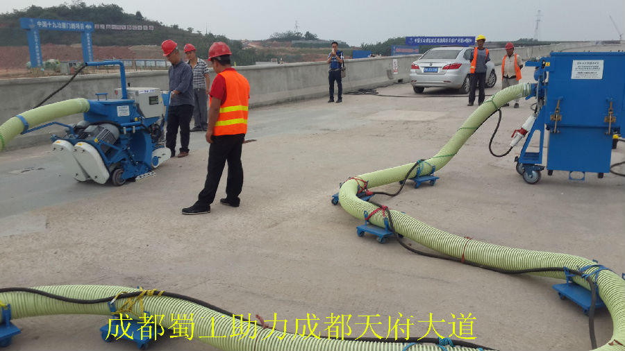由成都蜀工機(jī)械有限公司制造的蜀工2-550路面拋丸機(jī)在成都天府新區(qū)天府大道的互通作業(yè)工程里作業(yè)施工,它的功能是讓丸料沖擊路面的表面,使路面的表面粗糙并有去除殘留物的效果。同時(shí)除塵器產(chǎn)生的負(fù)壓會(huì)將丸料和清理的雜質(zhì)粉塵等回收經(jīng)過(guò)氣流清理后,完好的丸料會(huì)自動(dòng)循環(huán)使用,而雜質(zhì)和粉塵也會(huì)落入收塵箱中。蜀工2-550路面拋丸機(jī)能夠一次將混泥土表面的浮漿、雜質(zhì)清理清除并且可以對(duì)混泥土的表面進(jìn)行打毛處理,使其表面均勻粗糙,大大提高防水層和混泥土基層的黏著程度,以便防水層和橋面更好的集合,同時(shí)也能夠?qū)⒒炷嗤恋牧鸭y充分暴露出來(lái),以便起到防患于未然的作用。